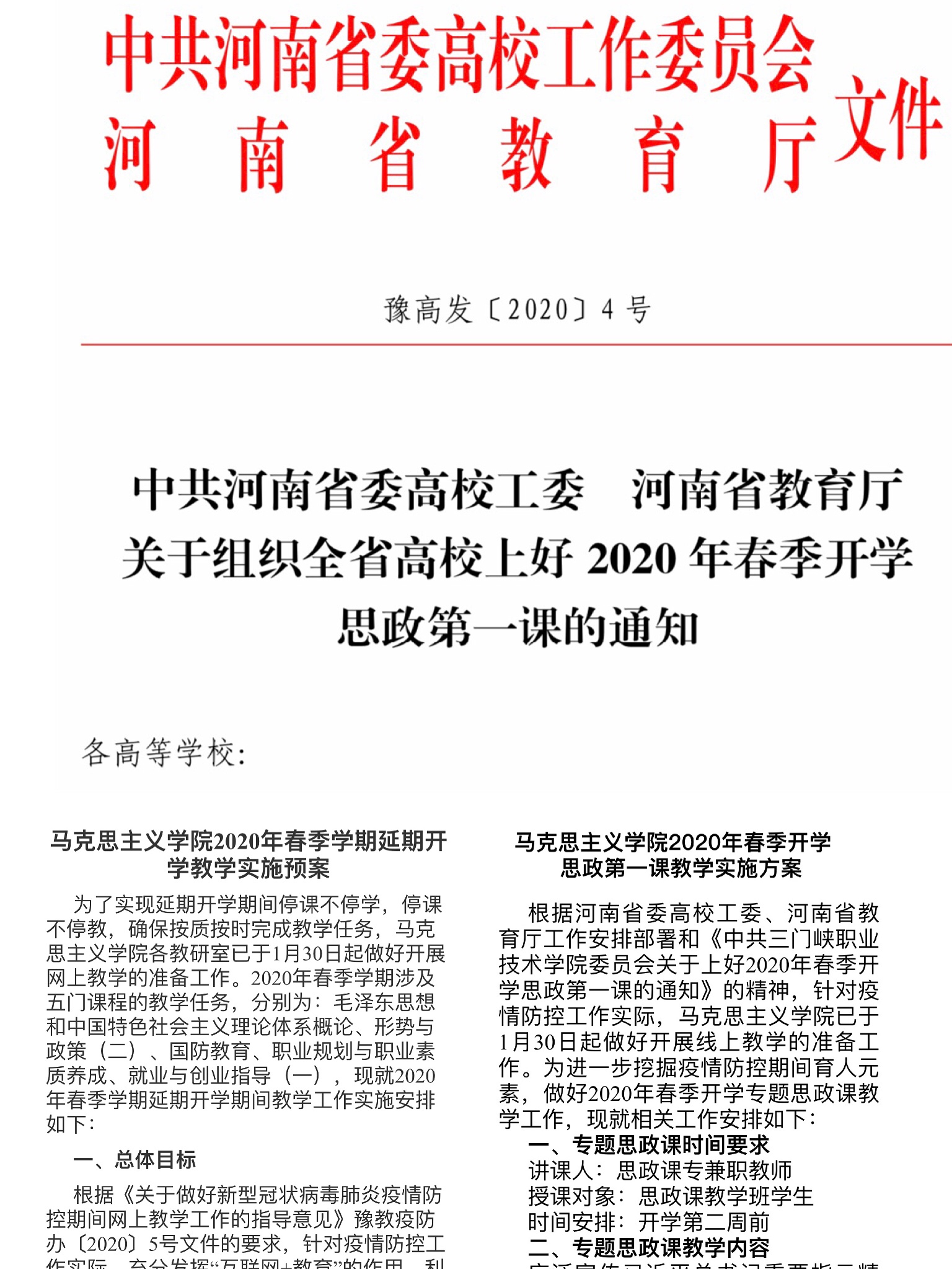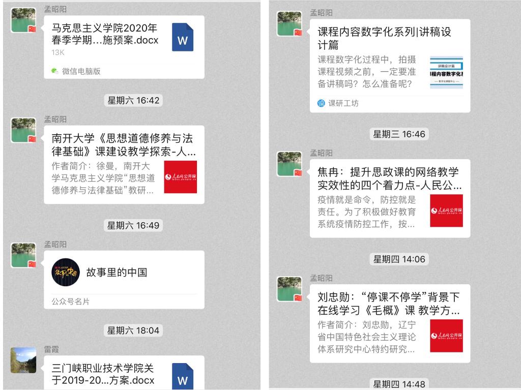太阳成集团tyc234cc经理孟昭阳通过微信工作群带领全体教师学习《关于组织全省高校上好2020年春季开学思政第一课的通知》、《太阳成集团官网委员会关于上好2020年春季开学思政第一课的通知》等相关文件,并要求教学科制定了《太阳成集团tyc234cc2020年春季开学思政第一课教学实施方案》,同时组织各科室负责人通过“学习强国”平台召开视频会议,进一步安排部署学校在延期开学情况下的教学工作要求,为做好思想政治课线上教学进行深入研讨。