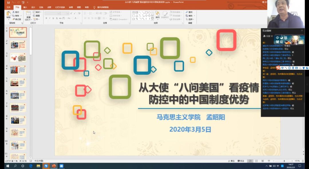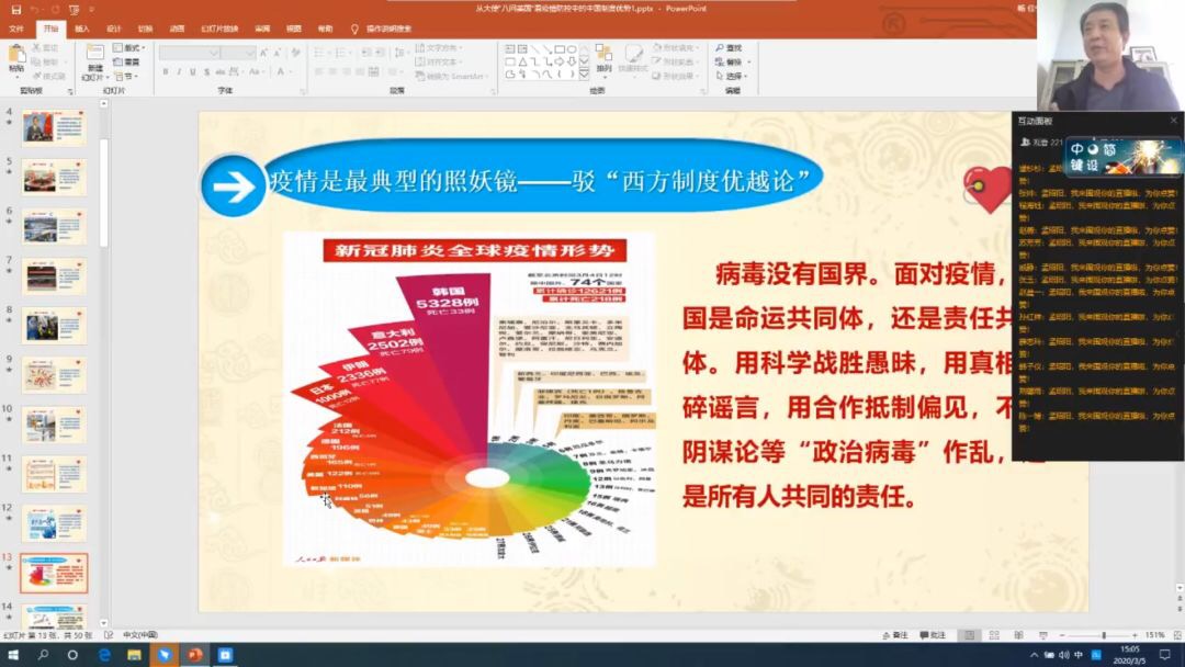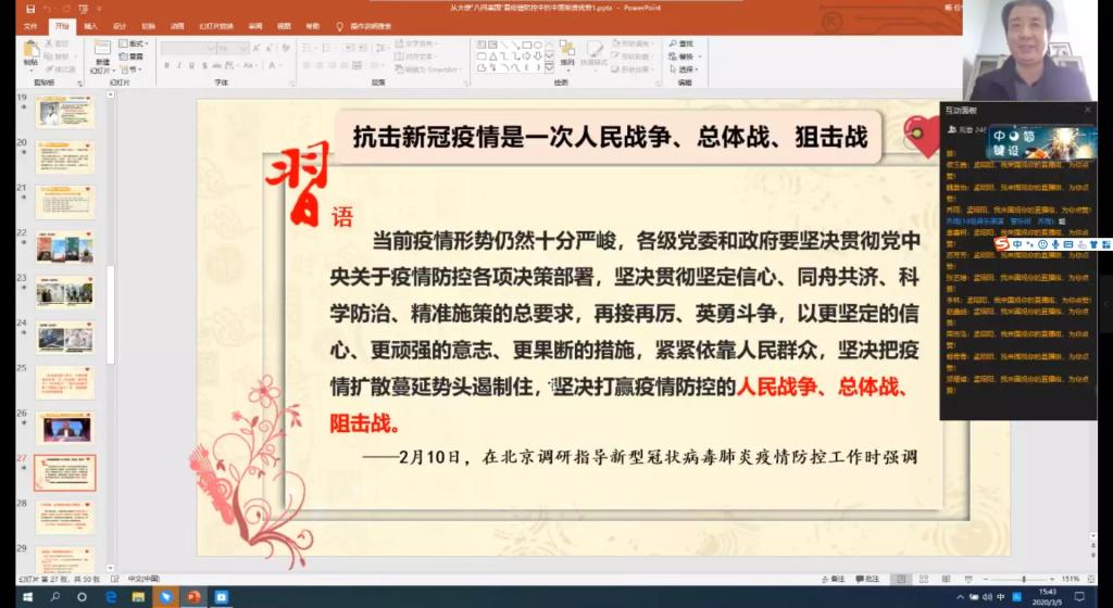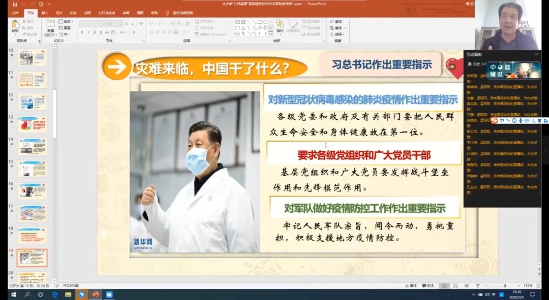 孟昭阳经理分别从:科学理性看待当前疫情;中国驻南非大使林松添:美国至少“八个做不到”;疫情是最典型的照妖镜——驳“西方制度优越论”;灾难来临,中国干了什么?;抗击新冠肺炎疫情是一次人民战争、总体战、阻击战;制度优势是战胜疫情的根本保证;把政治优势转化为疫情防控工作优势等七个方面展开了论述。