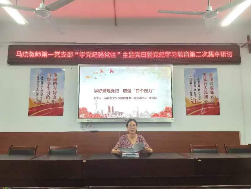 随后,支部书记李亚慈为全体党员教师讲授党纪学习教育专题党课——学好党规党纪,增强“四个定力” 。通过聆听专题党课,全体党员教师一致表示,要努力做到学纪、知纪、明纪、守纪,增强政治定力、纪律定力、道德定力、抵腐定力,始终做到忠诚干净担当。以党纪学习教育为契机,提高廉洁自律意识,发挥模范带头作用。