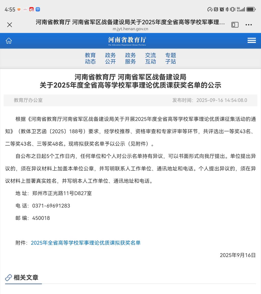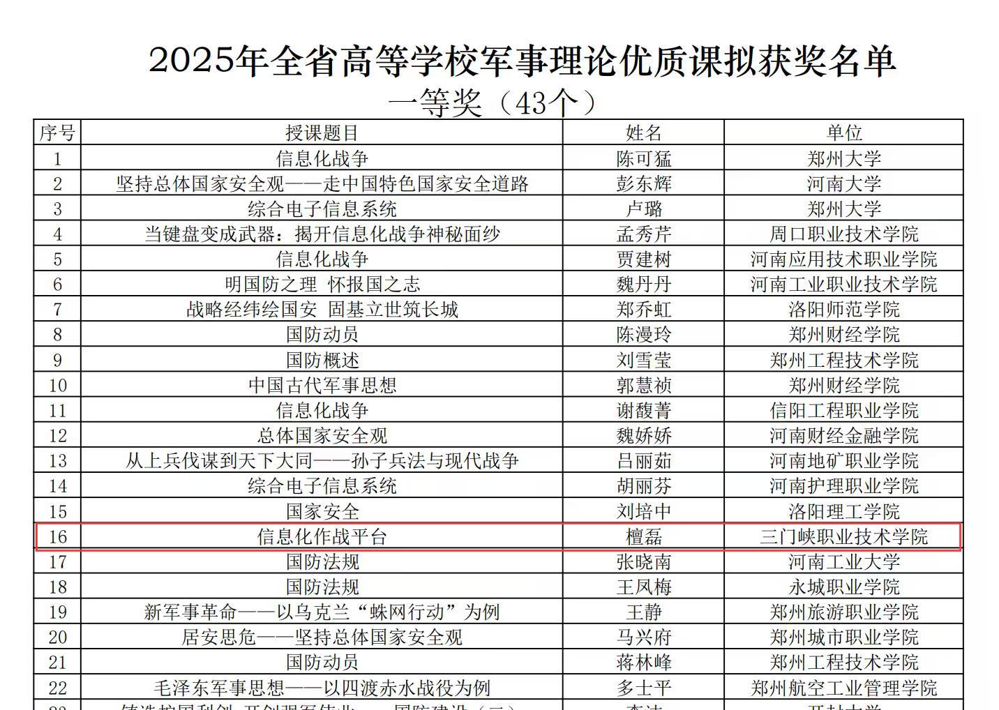 近日,从河南省教育厅传来喜讯,在刚刚结束的2025年全省高等院校军事理论优质课评选活动中,公司太阳成集团tyc234cc国防教育教研室檀磊老师主讲的《信息化作战平台》表现优异,荣获省级“军事理论优质课”一等奖。这一奖项是省内高校军事理论教学领域的最高荣誉。