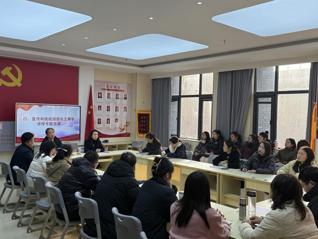 党委委员、宣传和统战部部长王静宇以《深学细悟全会精神,扎实推进“三进”工作——党的二十届四中全会精神解读》为题讲授专题党课,聚焦为党育人、为国育才的初心使命,以清晰的逻辑架构、精准的政策解读和通俗的语言表达,围绕“十五五”时期的历史方位与发展总体要求、“十五五”的战略任务和重大举措以及“十五五”推动经济社会发展的根本保证等方面,深入解读了党的二十届四中全会精神的理论精髓与实践要求,深刻阐释了全会精神与思政课立德树人根本任务的内在逻辑,深度把握了“三进”工作在筑牢青年理想信念根基中的关键作用。强调将全会精神作为思政教育的“根”与“魂”,深入推动全会精神与教材体系精准对接、与课堂教学创新融合、与员工思想实际深度契合,以“躬耕教坛”的自觉把理论优势转化为育人优势,切实培养出担当民族复兴大任的时代新人。
