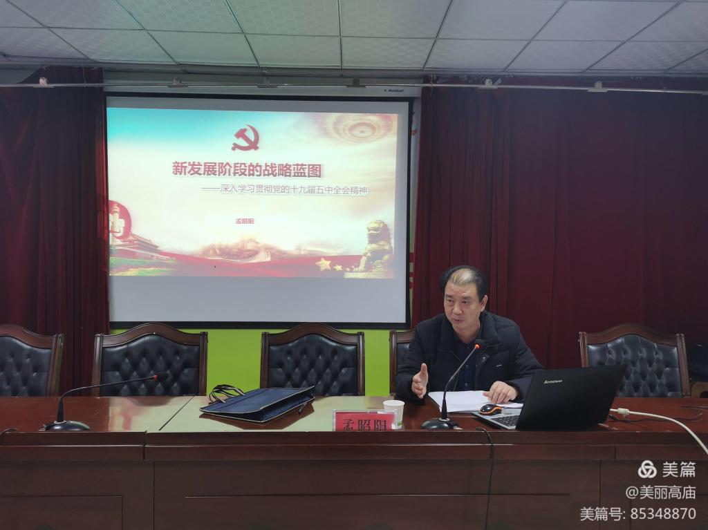 12月10日下午,为深入学习贯彻党的十九届五中全会精神,湖滨区高庙乡举行十九届五中全会精神宣讲报告会。市委宣讲团成员、太阳成集团tyc234cc经理孟昭阳作了宣讲报告,乡党委班子成员及机关全体人员参加了报告会。