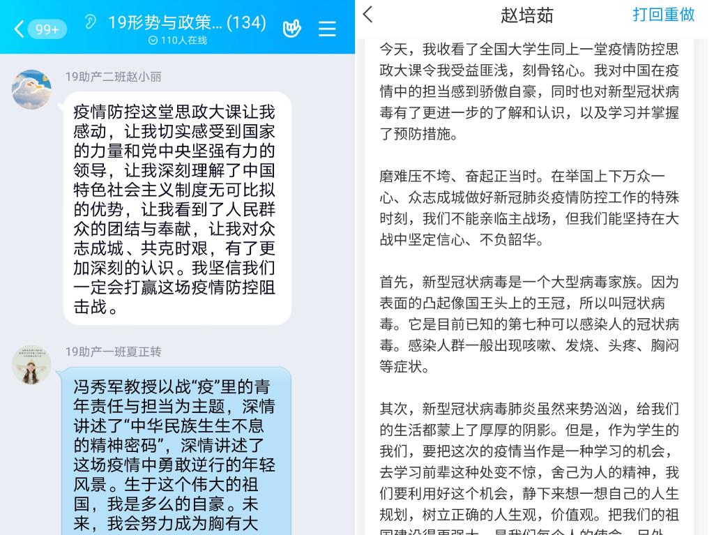 19助产二班的赵小丽说:“疫情防控思政大课”让我感动,让我切实感受到国家的力量和党中央坚强有力的领导,让我深刻理解了中国特色社会主义制度无可比拟的优势,让我看到了人民群众的团结与奉献,让我对众志成城、共克时艰,有了更加深刻的认识。我坚信我们一定会打赢这场疫情防控阻击战。”