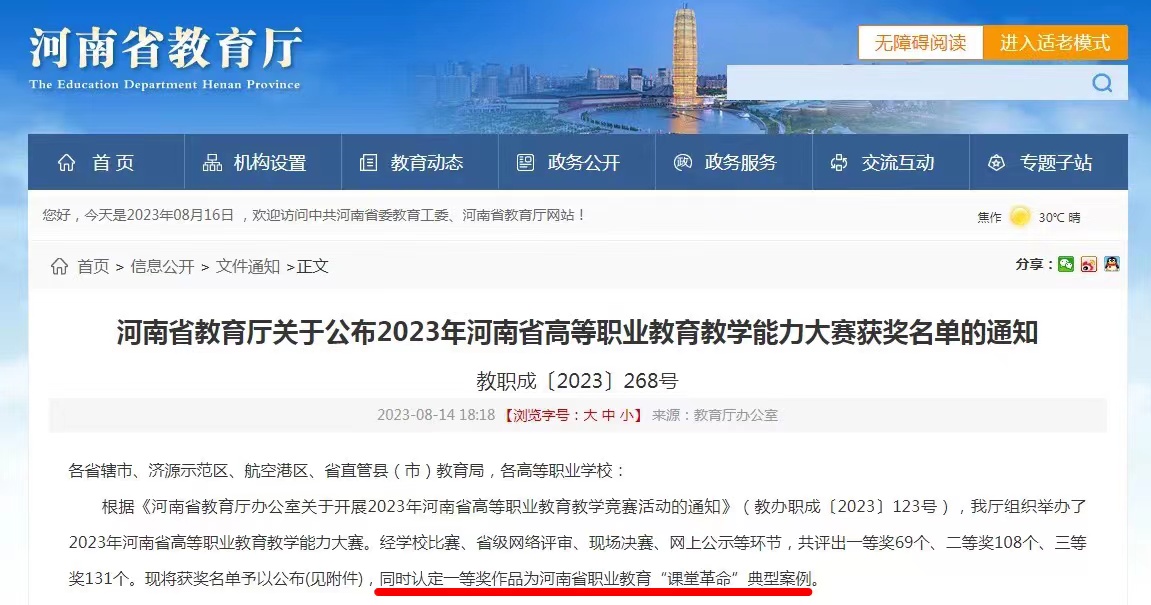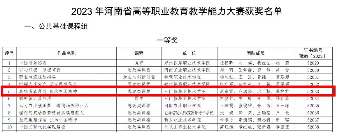 近日,河南省教育厅公布了2023年我省高等职业公司产品能力大赛获奖名单。公司教师赵东雪、齐潇晓、邱丁楠、茹梓君团队提交的作品《激扬青春理想 传承中国精神》历经省赛网评、现场决赛等环节,在公共基础课程组120余件作品中脱颖而出,荣获一等奖。自2020年起,公司教师团队已连续四年荣获此项比赛一等奖。同时,本次大赛一等奖作品被认定为河南省职业教育“课堂革命”典型案例。