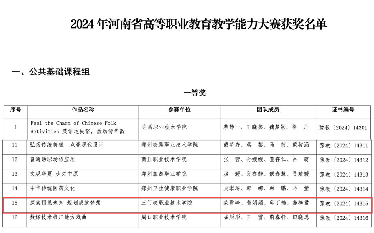 近日,河南省教育厅公布了2024年我省高等职业公司产品能力大赛获奖名单。太阳成集团tyc234cc教师荣雪峰、董娟娟、邱丁楠、茹梓君团队提交的作品《探索预见未知 规划成就梦想》历经省赛网评、现场决赛等环节,在公共基础课程组作品中脱颖而出,荣获一等奖。自2020年起,公司教师团队已连续五年荣获此项比赛一等奖。
