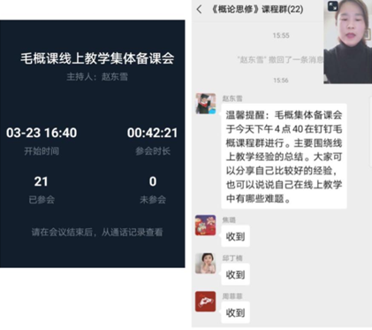 为响应省教育厅和学校工作部署,按照“停课不停学、学习不延期”的总体指导思想,努力探索《毛泽东思想和中国特色社会主义理论体系概论》课教师线上集体备课机制,保障疫情期间该课程教学工作的有序进行,3月23日下午,毛泽东思想和中国特色社会主义理论体系概论教研室利用钉钉平台组织课程组全体教师召开线上集体备课视频会议,本次备课会的主题是总结线上教学经验,集中研讨线上教学共性问题,保证线上教学质量。备课会由赵东雪老师主持,课程组全体教师参加了本次会议。教学秘书雷霞老师出席并对《毛泽东思想和中国特色社会主义理论体系概论》课线上教学提出宝贵意见。