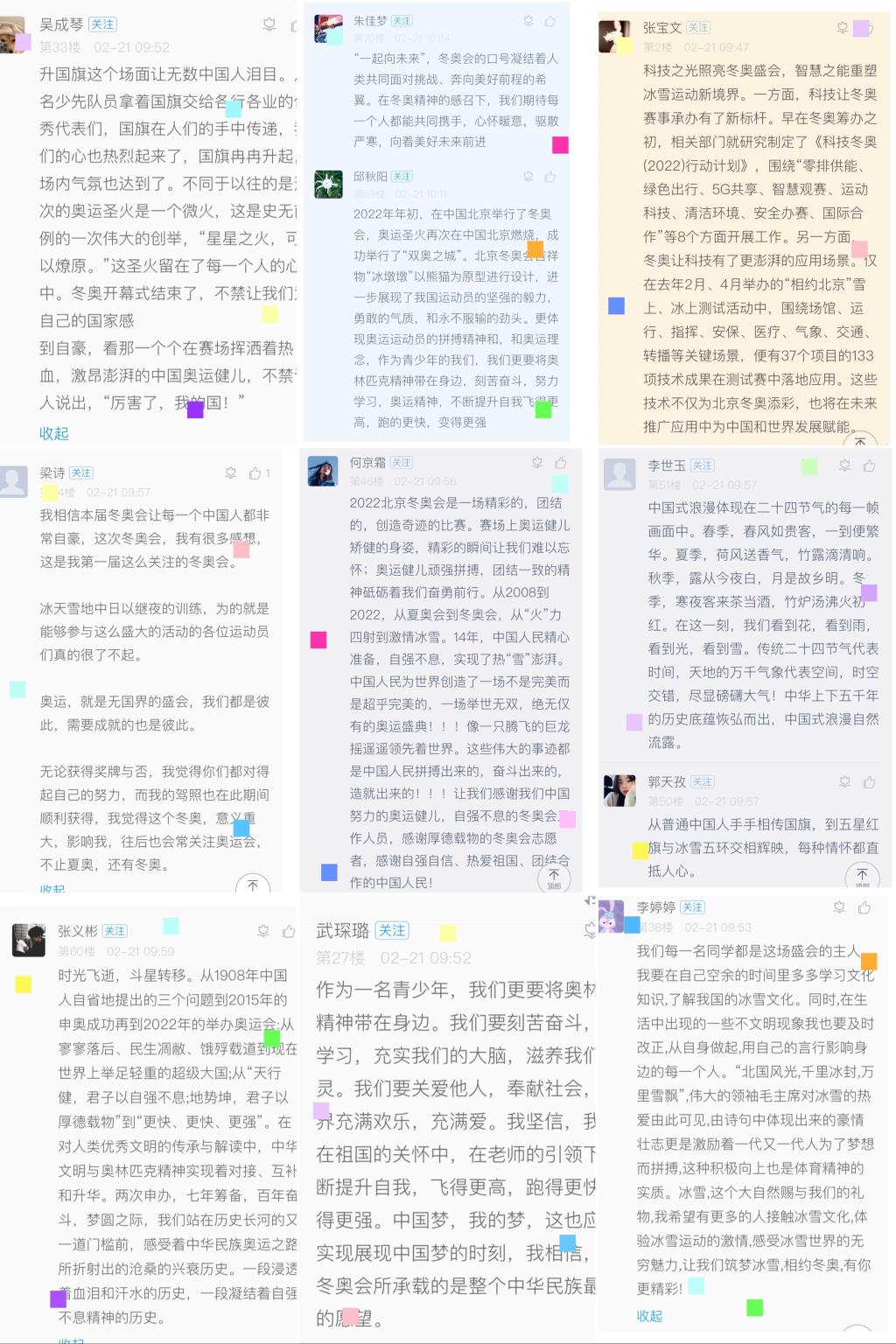 在课堂上,“冰墩墩”、“雪容融”、武大靖、谷爱凌……一个个耳熟能详的形象与人物接连出现,激发起员工的浓厚兴趣。员工们也积极连麦、参与主题讨论,踊跃发言,分享自己青春助力冬奥的事迹,上传令自己倍受感动的精彩瞬间,讲述心中的冬奥英雄以及观看冬奥会的激动心情,课堂气氛十分活跃。