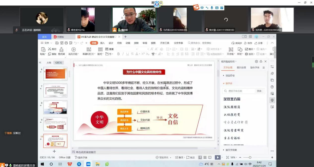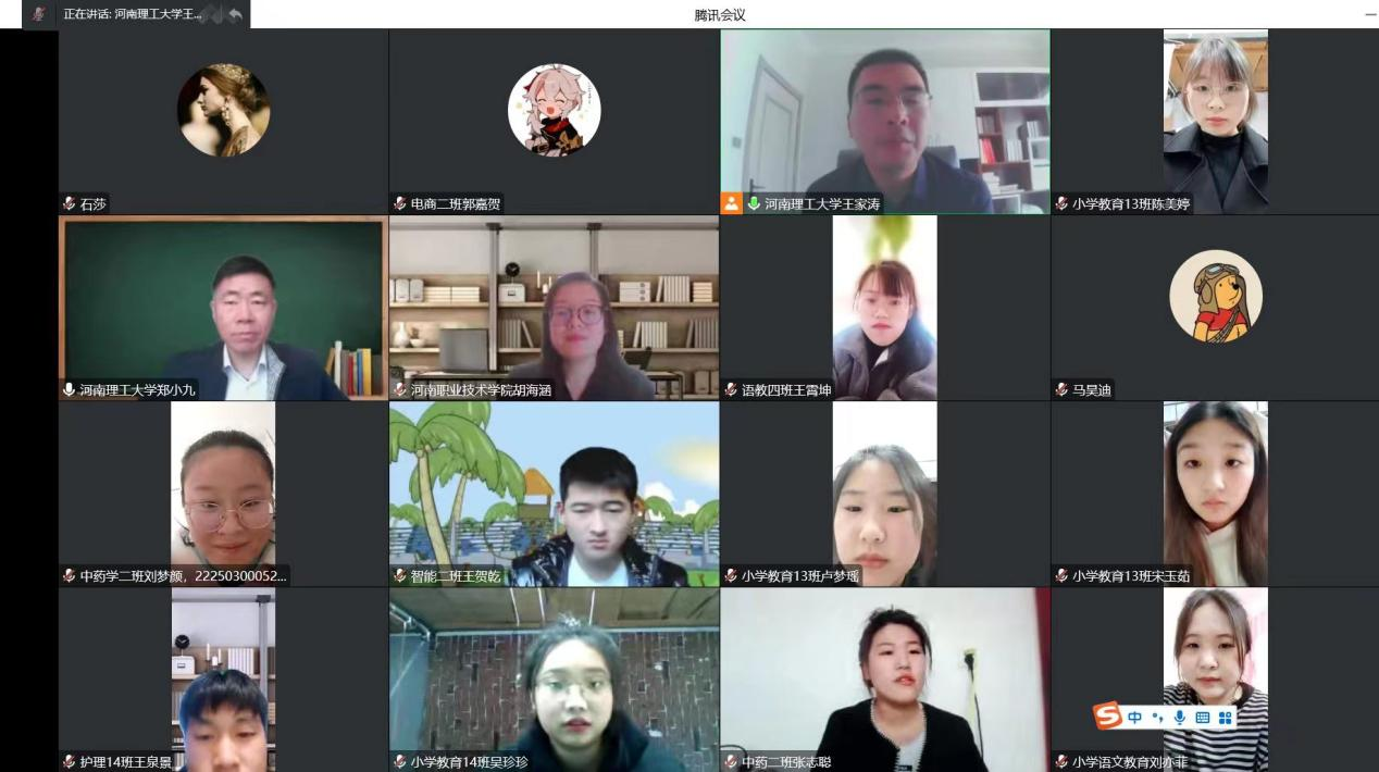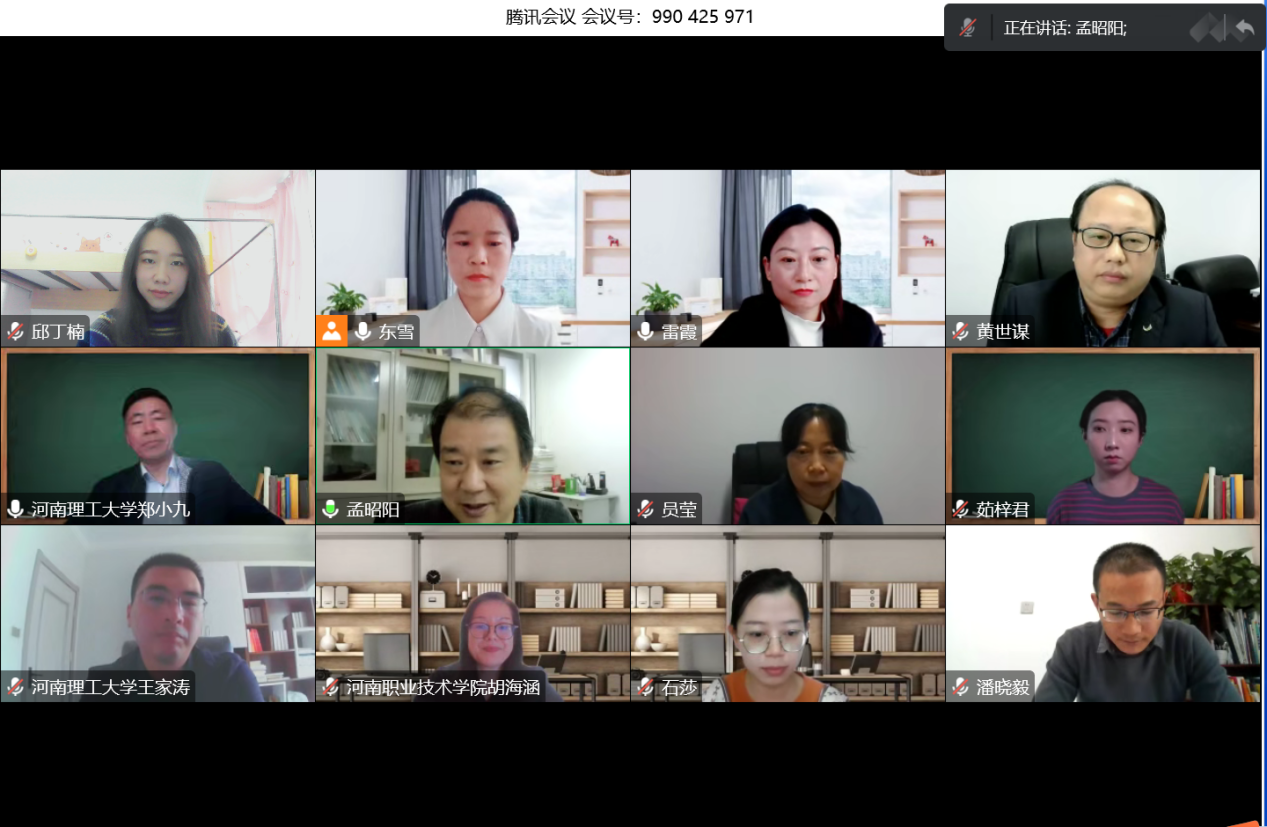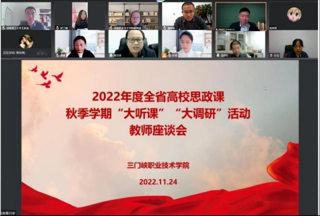 为深入贯彻习近平总书记在中国人民大学考察时的重要讲话精神,认真落实《中共河南省委教育工委办公室 河南省教育厅办公室关于开展 2022年度全省高校思政课秋季学期“大听课”“大调研”活动的通知》(教思政函〔2022〕654号),11月24日上午,以河南理工大学马院经理郑小九为组长、由郑州大学马院副教授郭文荣、河南职业技术学院马院副经理胡海涵、河南理工大学马院教师王家涛组成的第八组专家云端调研指导公司思政课教学工作。公司党委委员、副经理黄世谋、教务处处长员莹、马院经理孟昭阳以及思政课教师代表、员工代表参加了调研。
